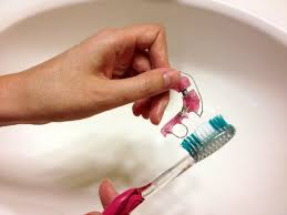 مسواک نرم و آب بشوئید. (توجه نمائید که الکل موجود در بعضی دهانشویه ها می تواند به پلاک شما آسیب وارد نماید)